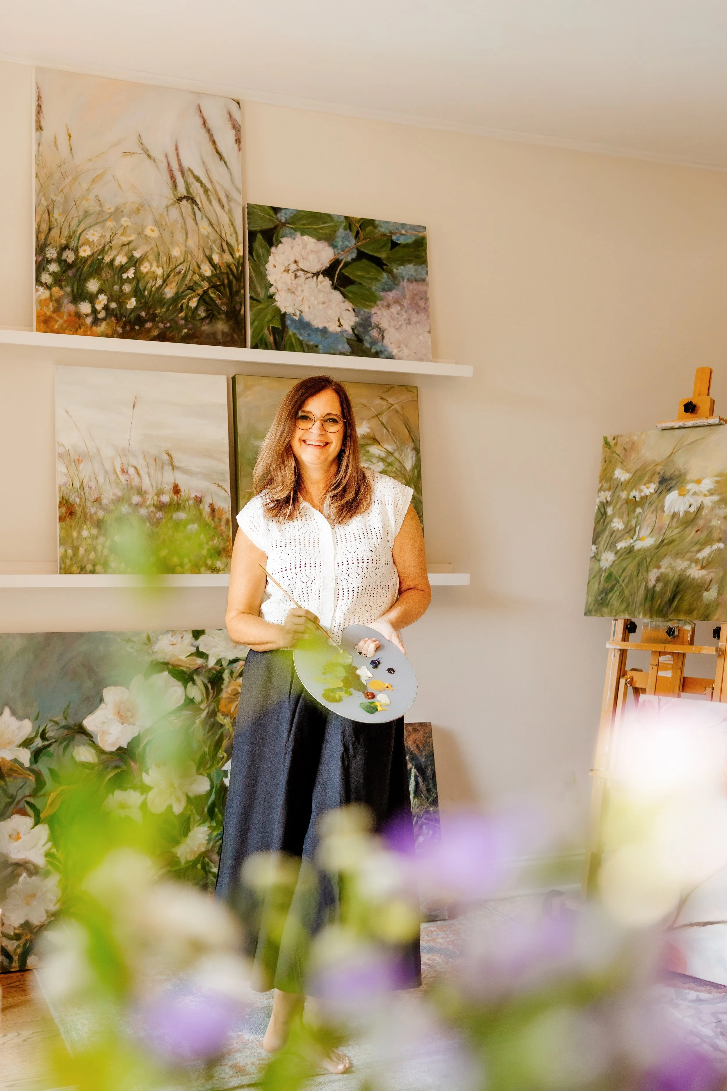 I was raised in the scenic mountains of Brevard, NC, where the beauty of nature sparked my creativity. I’m a contemporary artist whose return to painting came later in life. After earning a degree in Clothing, Textiles, and Merchandising from Western Carolina University, I stepped away from the creative world to raise my three children. As they grew older, my passion for painting was reignited, and I returned to my artistic roots.